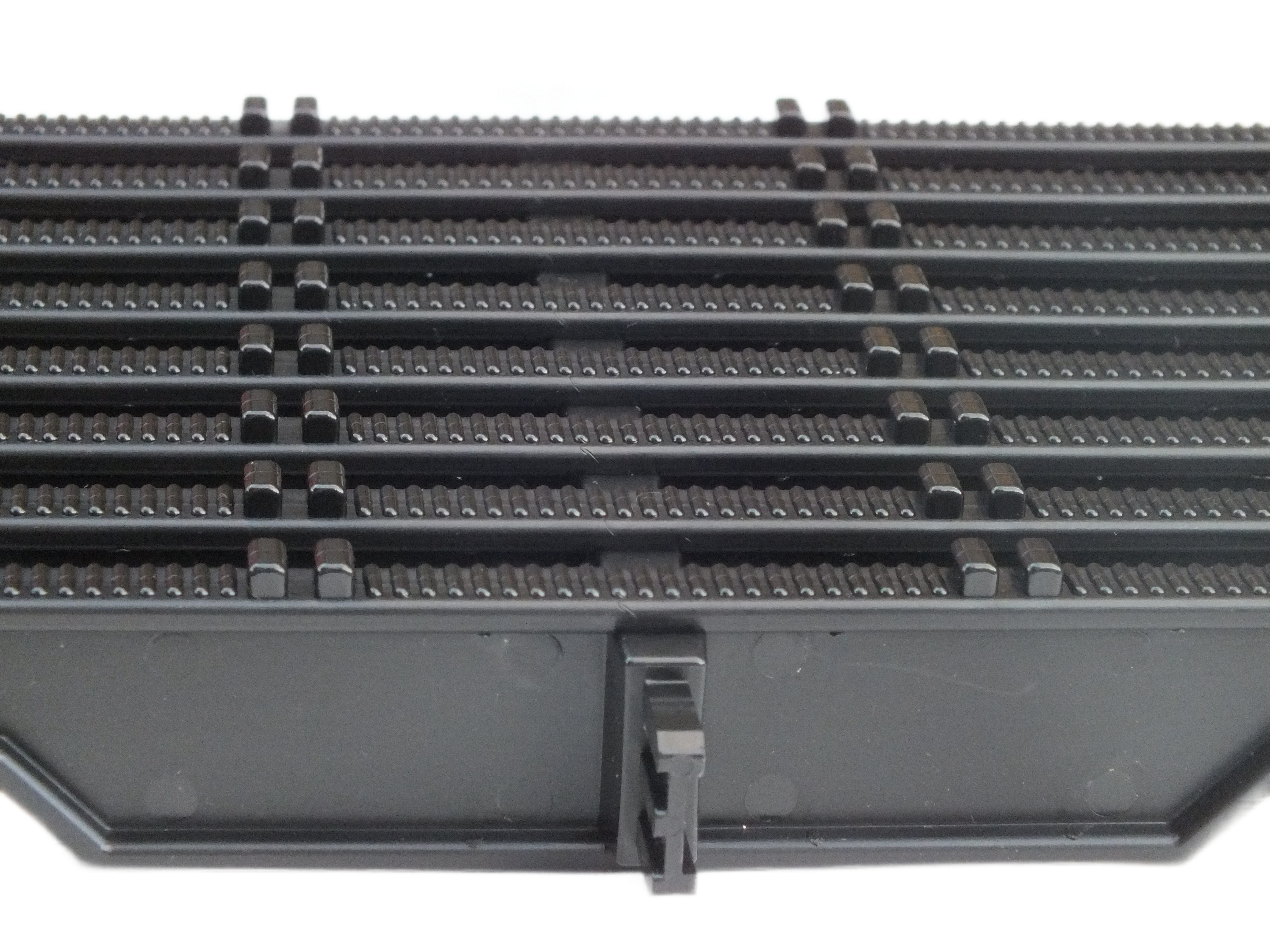 Решётка с фиксаторами разработана для интеграции керамогранитной облицовки в системы щелевого водоотвода. Конструкция решётки предусматривает наличие четырёх фиксирующих элементов, предназначенных для надёжной фиксации трёх полос керамогранитной плитки. Данная конфигурация формирует четыре водоприёмные щели, обеспечивающие эффективный отвод воды в дренажный лоток.
